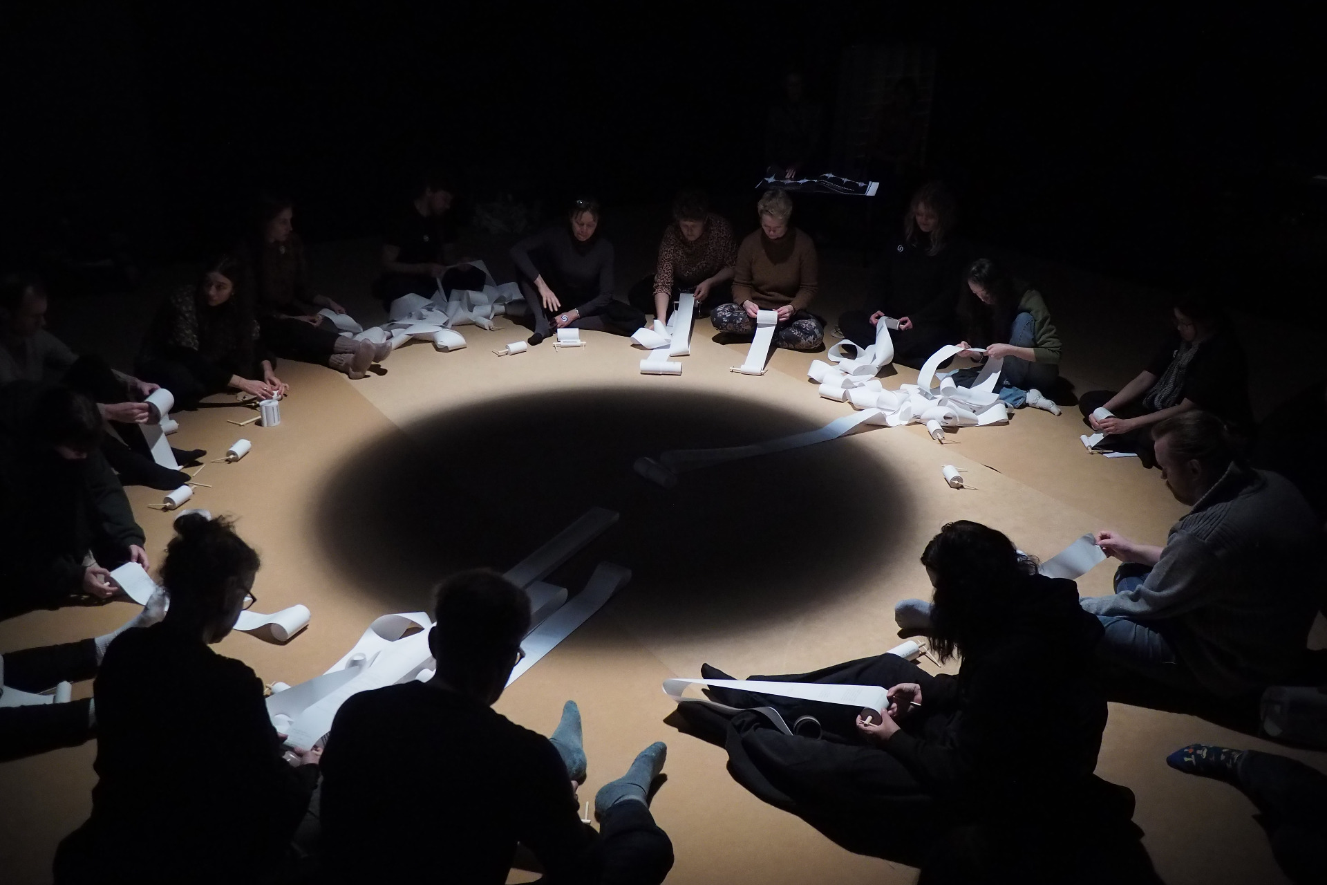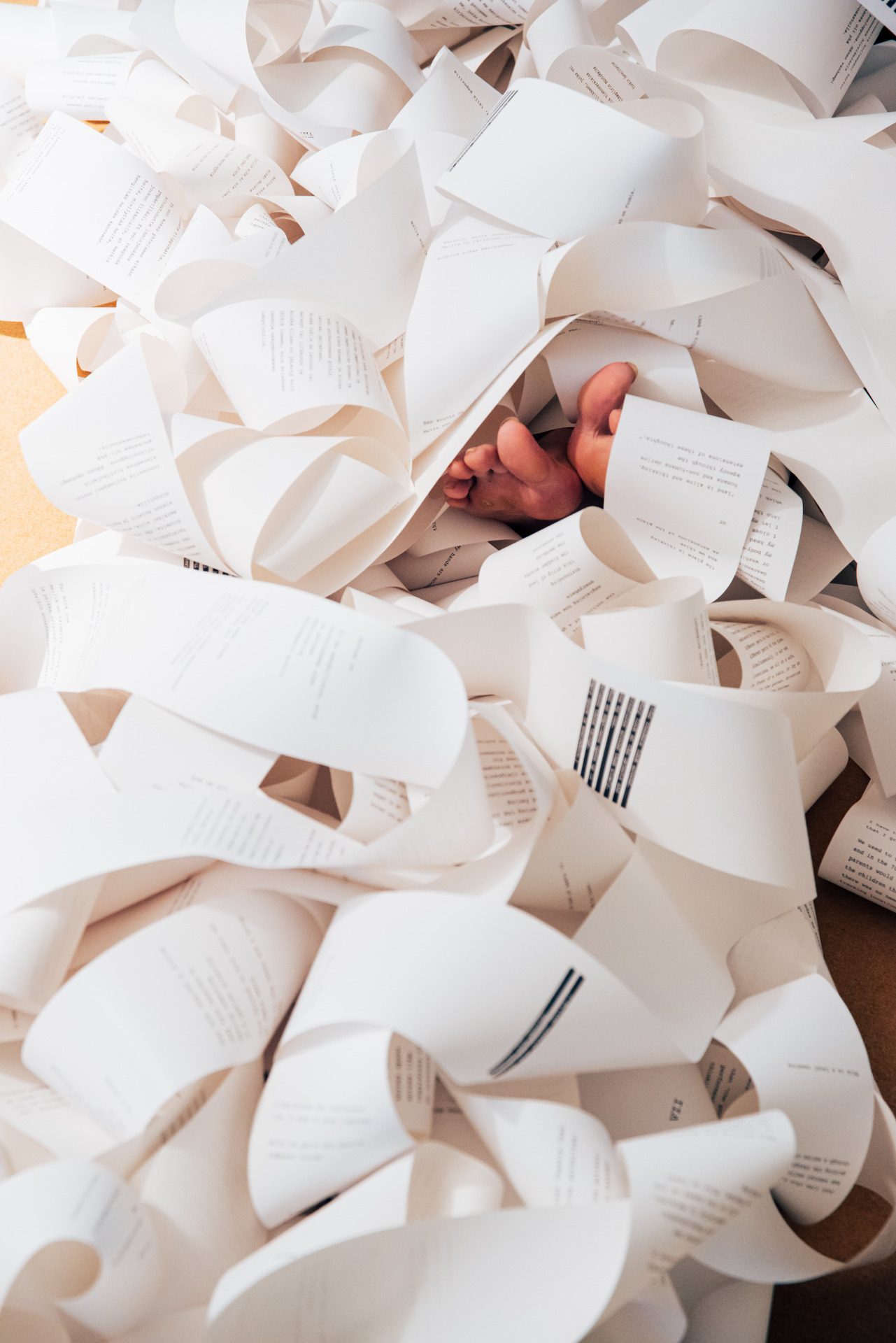 Time and Place takes the form of paper rolls mounted on wooden reading devices made out of a piece of circular board and chopsticks. The paper rolls are unwound when being read, leaving a stream of paper in the performance space.